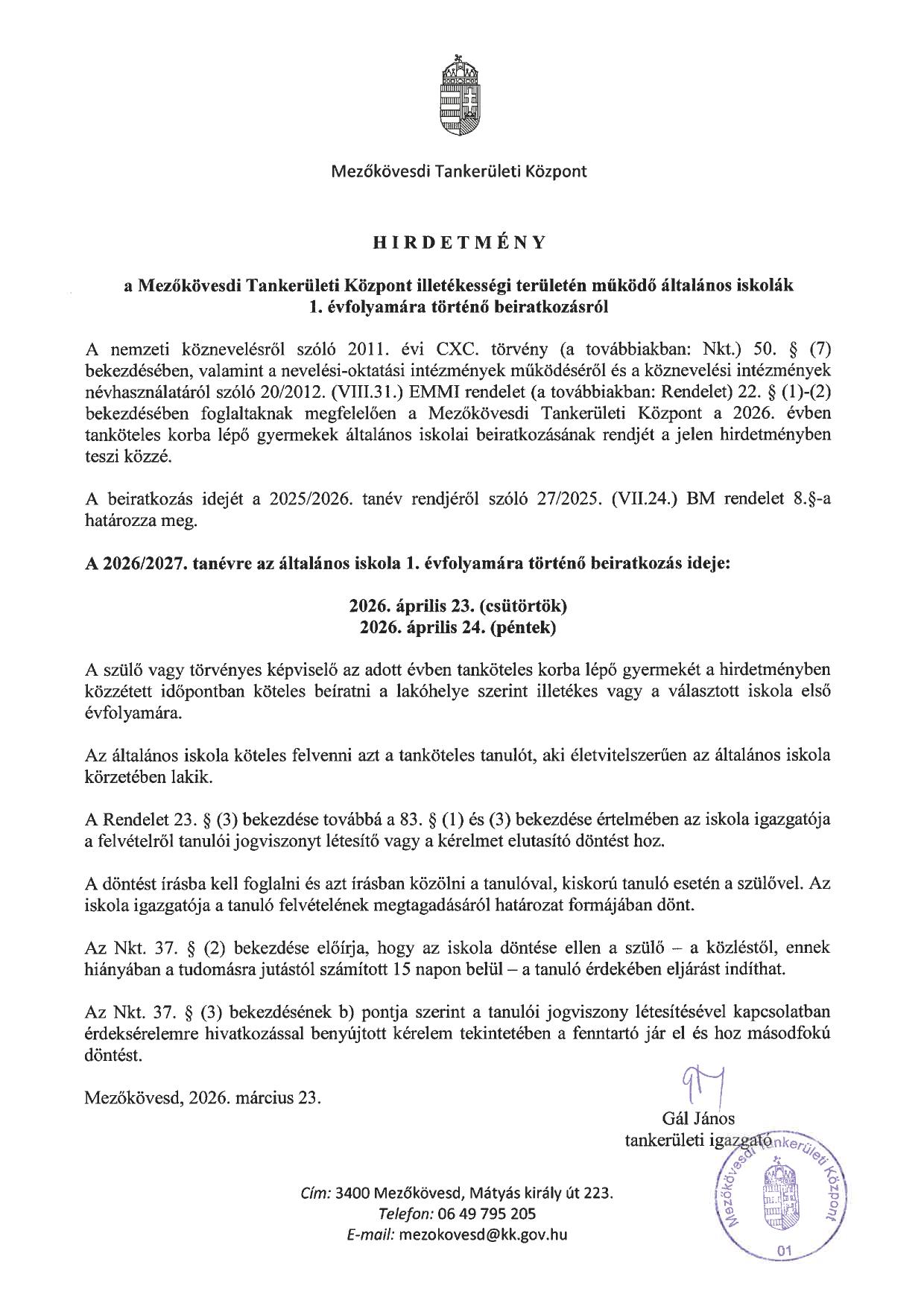 Hirdetmény 2026/2027. tanévre 1. évfolyamra történő beiratkozásról